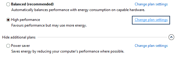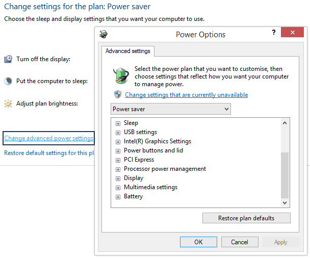 Windows by default has three power plans, namely, “Balanced”, “Power saver” and “High Performance”. By default, the settings for the power saver plan are ideal for using your laptop without being plugged in, but if you want to tweak it more then you can go to Control Panel > Power Options and select “change plan settings” against the “Power Saver” plan and now you can change the settings for this plan. You can also change the advanced settings to get some more life out of your battery before it dies.